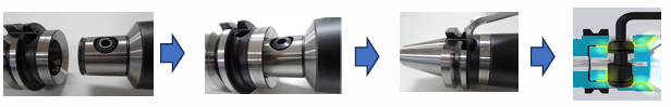 本システムの特徴は、内側から開くラジアルピンによる結合構造にあります。ピンが径方向に広がりながら工具を固定するため、結合部の剛性と求心性が非常に高くなっています。この構造により、コレットチャック・ミーリングチャック・タップコレットなど多様なツーリングレイアウトへの変換が1台のシステムで可能となっており、加工要求の変化に柔軟に対応できます。