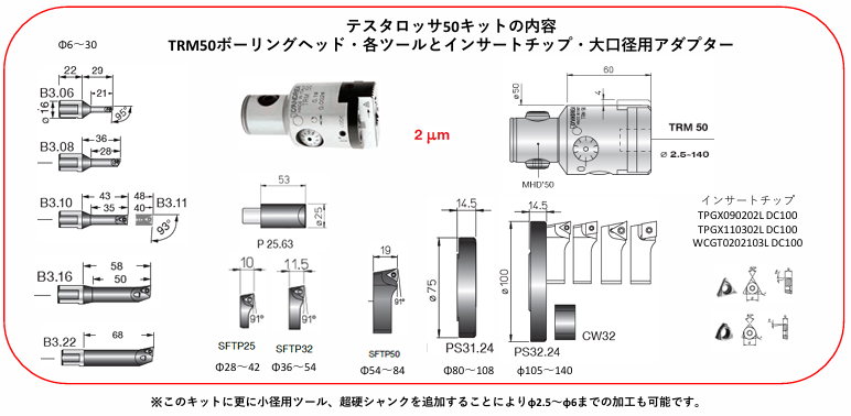 対応加工径はφ6からφ140まで(ボーリングキット・TRM50使用時)。1ヘッドでこれだけの範囲をカバーできるキット構成は他社製品では例を見ない仕様であり、工具管理の煩雑さを大幅に軽減できます。