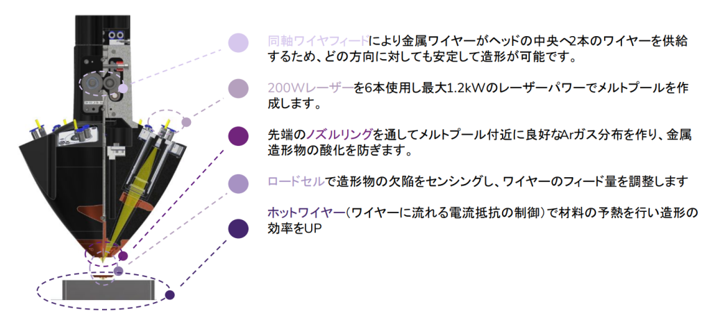 金属3Dプリンター「Meltio」は、DED方式の中でも ワイヤーDED方式(Wire Directed Energy Deposition) を採用しています。粉末を使用する「パウダーDED方式」と異なり、ワイヤーを直接溶かして造形する点が大きな特徴です。