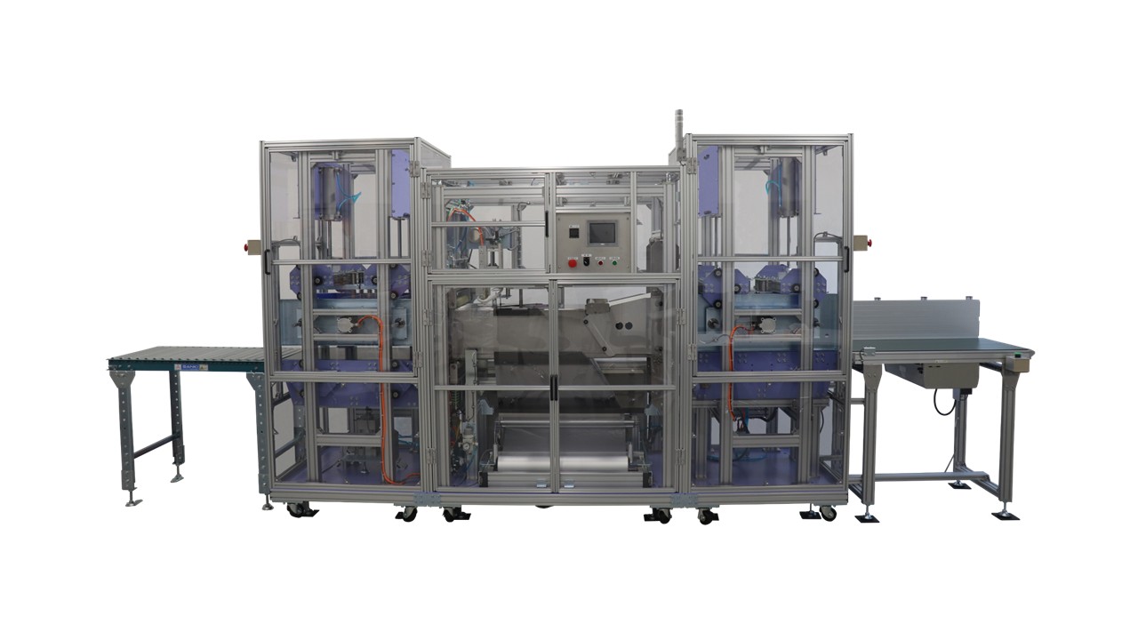 タオル専用自動包装機「SS-032」は、タオルを投入コンベアにセットしてスタートボタンを押すだけの簡単操作で、たたみ以降の工程である脱気から全面シール・カットすべての工程を自動で行います。