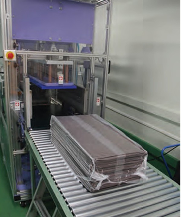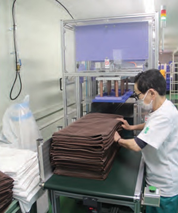 新事業として力を入れるタオルの効率的な生産に向けて、タオルフォルダーへの投入を自動化する設備やタオル専用自動包装機「SS-032」を導入し、「投入→たたみ→包装」の作業を自動化しています。