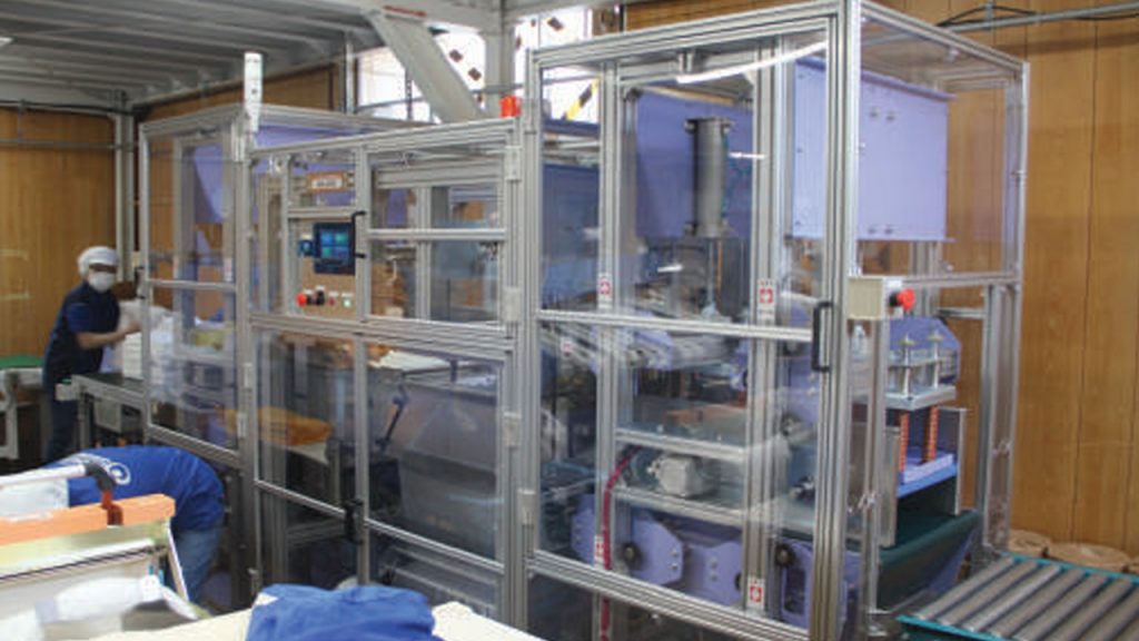 タオルフォルダーと「SS-032」を連結し、運搬作業や袋詰め作業を自動化。省人省力やライン稼働時間短縮を見込めるラインを構築しています。