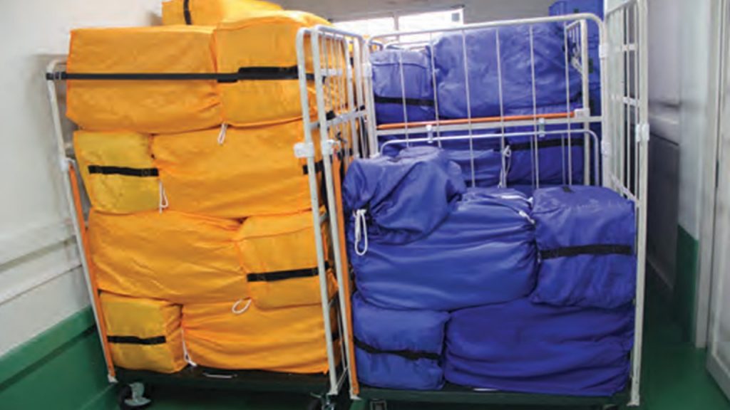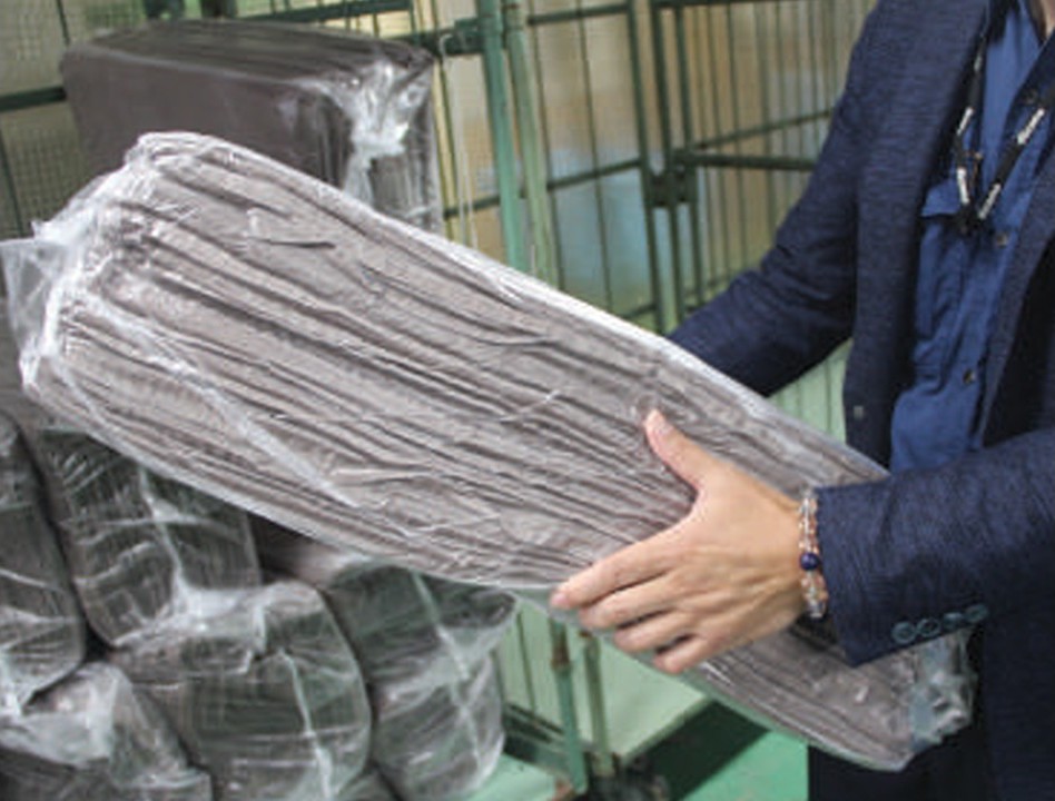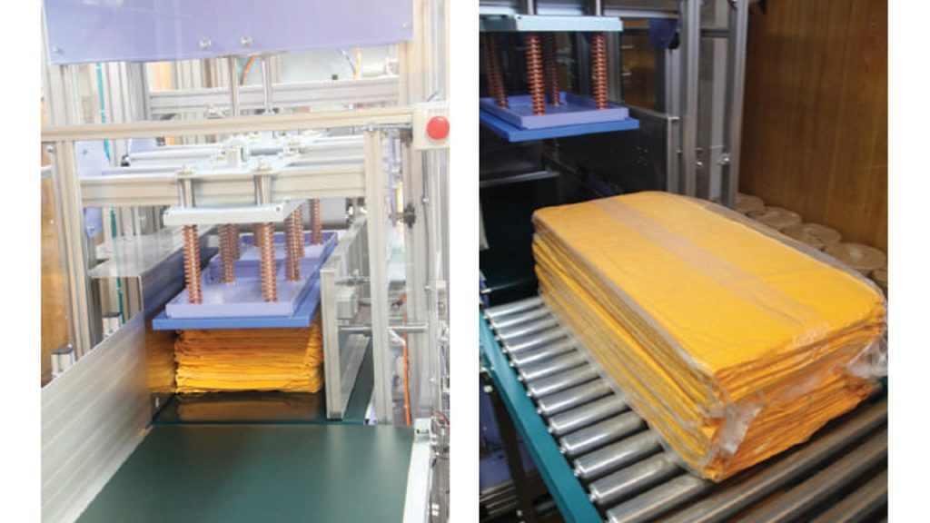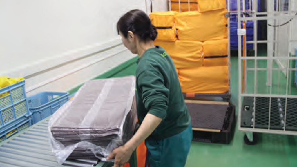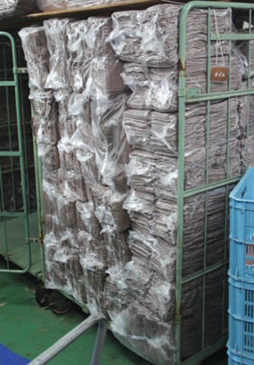 また圧縮した状態で包装する「脱気包装」は、結束なしでコンテナワゴンに積み重ねても運搬時に荷崩れしないといった特徴があります。手作業で行った包装と比較して40%ほど嵩が低くなり、運搬用のワゴンに従来の2倍近く積載できるといった効果が出ています。