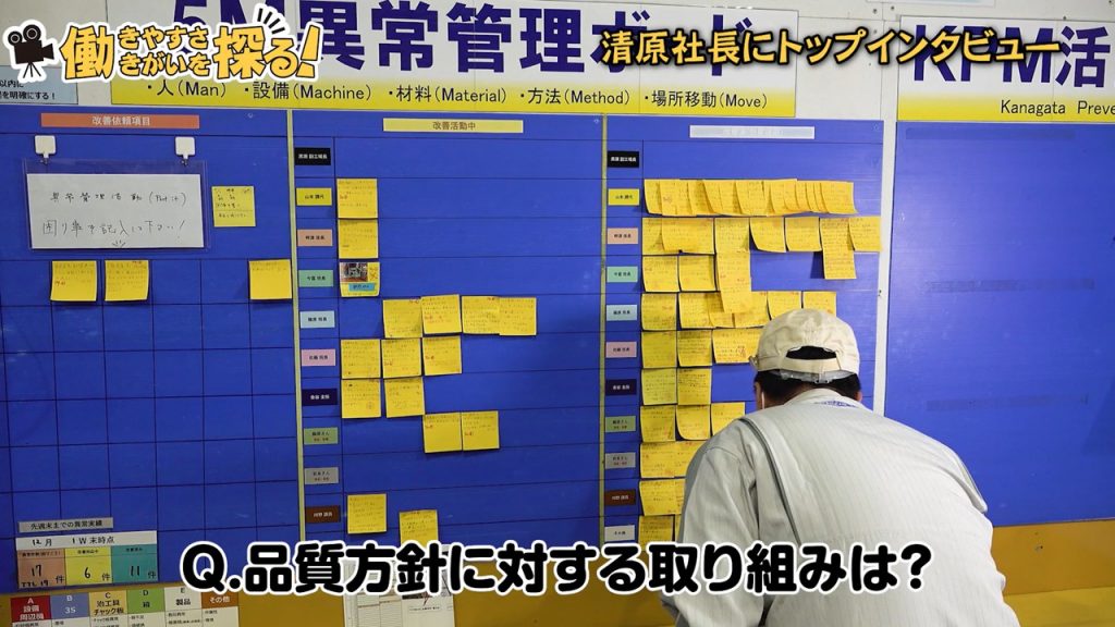 「万に一つの不良対策」として、モノづくりのラインを見ながらみんなで必死になって改善を進めていますが、その中で「品質3大活動」というものがあります。これはものづくりの最中に異常がないか、いつもと違うとこはないかなど、小さい問題を早めに出して抽出して手を打つ。こうしたことを毎日繰り返していくことですね。