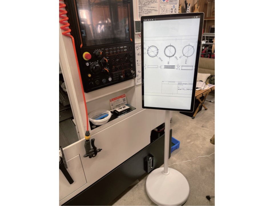 しかし、GOLDIVA Angler’s Armsでは、加工に関わるほとんどの作業を工作機械の前で完結できるよう作業の効率化を図り、スタンド一体型ディスプレイ「Movable Smart Board」に「MAZATROL DX」の画面をリモート表示しています。