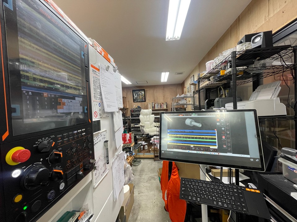 これにより、オペレーターが座ることなく、機械の前で「MAZATROL DX」をスムーズに操作できる環境を実現しています。特に、制御盤にはないマシニングのシミュレーション機能を、まるで制御盤で操作しているかのように作業ができる点を非常に便利に感じています。
