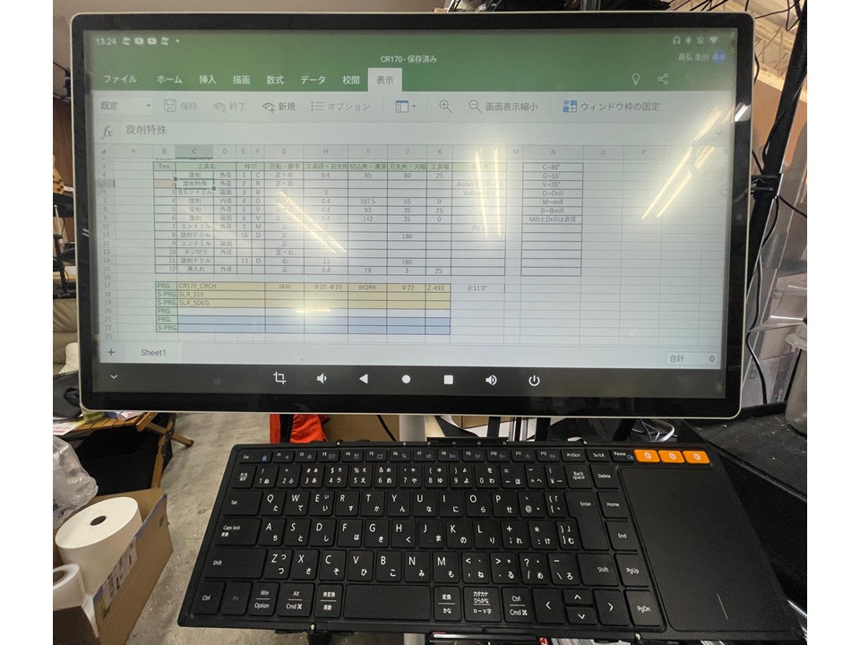これらのデータは、工作機械の前で作業をしながら、Movable Smart Boardに表示されたExcel表へ入力しています。入力の際は、Bluetooth対応のモバイルキーボードを接続し、リアルタイムで記録を行っています。
