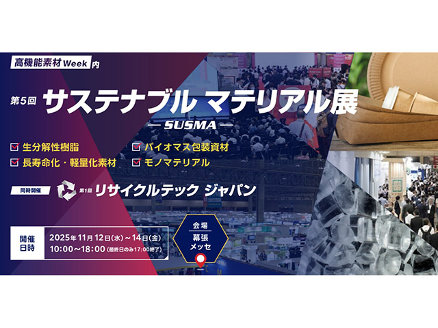 サステナブル マテリアル展 – SUSMA – はサステナブル材料(環境配慮型材料)およびその製造・リサイクル技術に特化した専門展です。エレクトロニクス、自動車、電池、建築・建材などの工業分野から食品・飲料・日用品・雑貨などのメーカーの技術者・商品企画・経営層などが来場します。